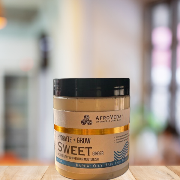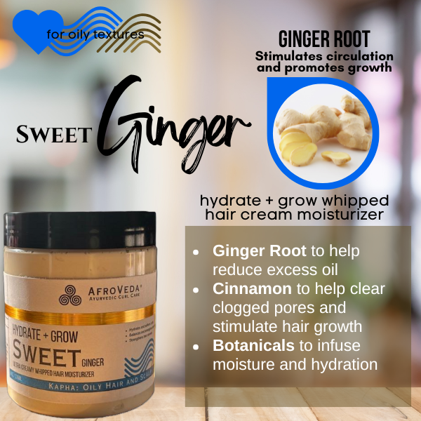 For an oily Kapha scalp, the focus is on balancing excess oil, clearing clogged follicles, stimulating circulation, and using herbs that are warming and nourishing. Our Sweet Ginger Whipped Hair Moisturizer checks all of these boxes, PLUS gives you styling ability to keep your natural curls vibrant.